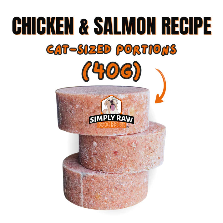 Curious cats welcome! Made with the same high-quality ingredients you already trust in your dog’s favorite raw food, our new Chicken and Salmon raw cat food is crafted to meet the unique nutritional needs of your feline. A balanced blend of muscle meat, secreting organs, Omega-3s and added taurine that keep your kitties purring and playful. Perfect for multi pet homes where the dogs bowl is already a hit and the cat demands a seat at the same table.