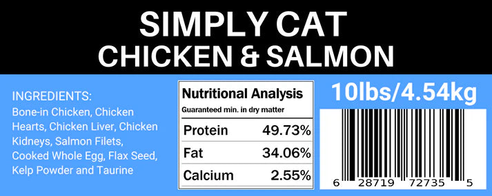 This recipe consists of 65% Bone-In Chicken, 20% Chicken Hearts, Livers, Kidneys, 10% Wild Pacific Salmon, 5% Cooked Whole Egg, Flax Seed, Kelp Powder and Taurine